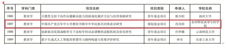 近日,教育部社科司发布了《2025年度教育部人文社会科学研究一般项目评审结果的公示》,我校肖丙珍副教授申报的课题《中国共产党百年中小学教科书铸牢中华民族共同体意识研究》获批规划基金项目立项。
